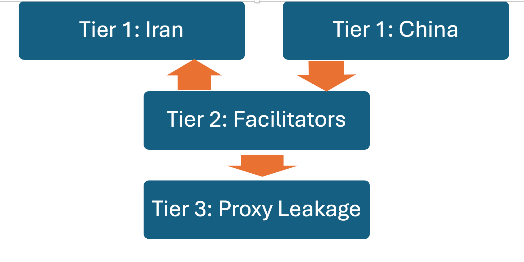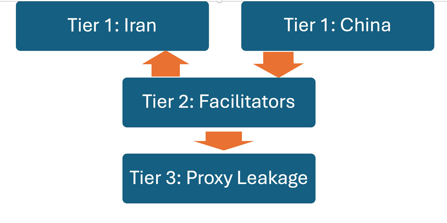 A model of how Tier 1 Iranian oil smuggling indirectly facilitates Tier 3 proxy funding through Tier 2 facilitators.