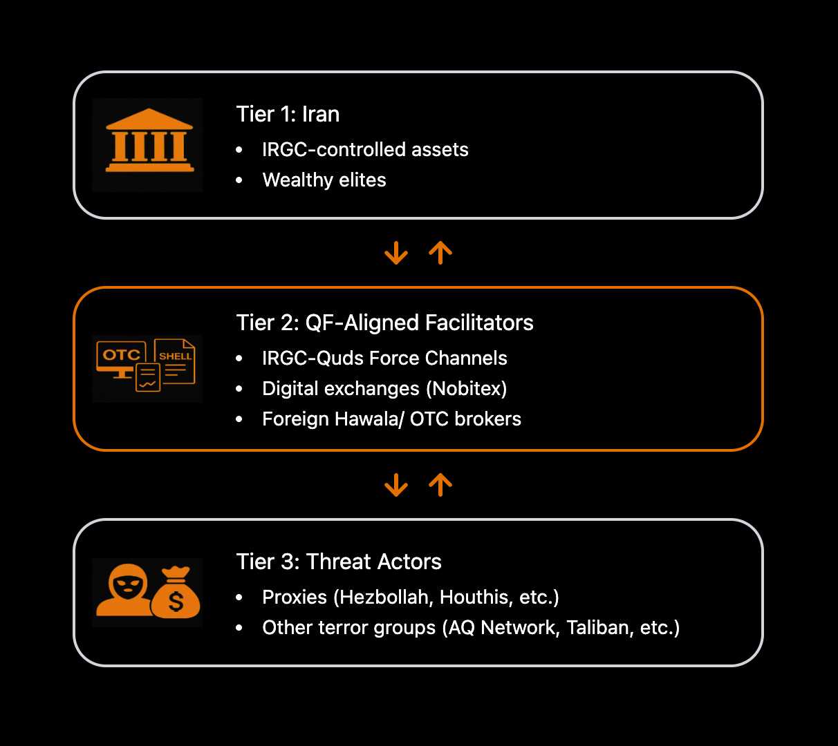 Crucially, this infrastructure is not exclusively used by Iranian proxies. The same Tier 2 channels that facilitate proxy finance also provide liquidity, laundering, and settlement pathways for non-proxy militant actors operating in proximity to Iranian networks. Taliban-linked actors have laundered funds through Iranian facilitation channels, while residual al-Qaeda networks have exploited Iran-based logistics, transit, and financial intermediaries under varying degrees of state tolerance. These interactions need not reflect unified strategic intent to generate risk: they emerge from the availability of deniable, sanctions-resilient infrastructure operating beyond effective oversight.