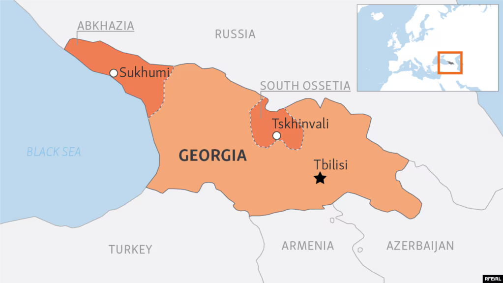 Georgia’s breakaway regions of Abkhazia and South Ossetia (dark orange) are officially recognized and supported by Russia. Image source