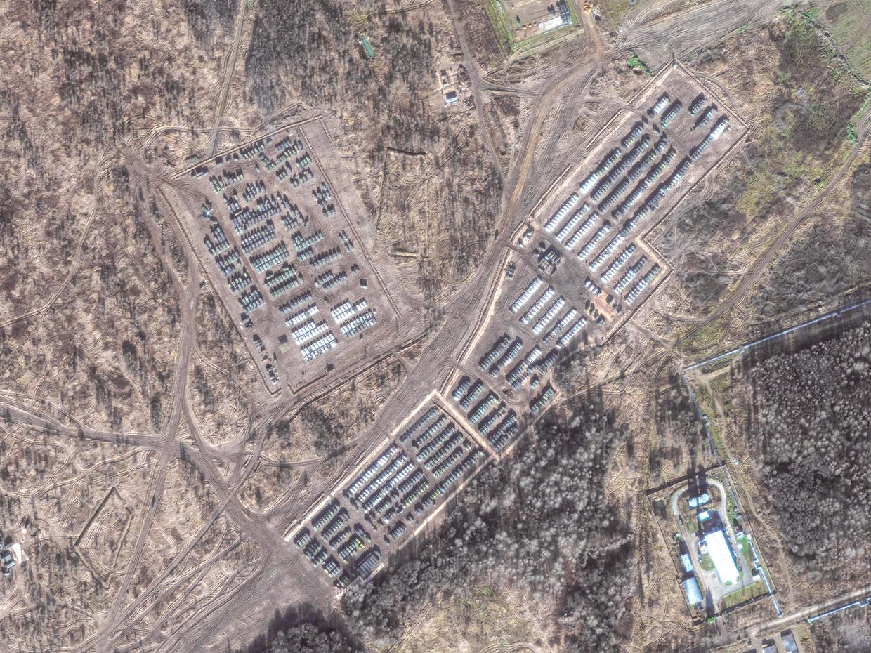 U.S. intelligence produced satellite images of Russian troops massed on the Ukrainian border prior to Russia’s 2022 invasion. Image source