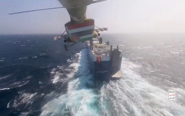 Yemeni Houthis boarding a Israel-linked ship on the Red Sea. Source