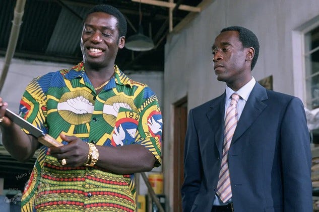 A screenshot from the movie Hotel Rwanda, in which a Hutu warlord shows off his PRC-made machete. (Source: Douban)