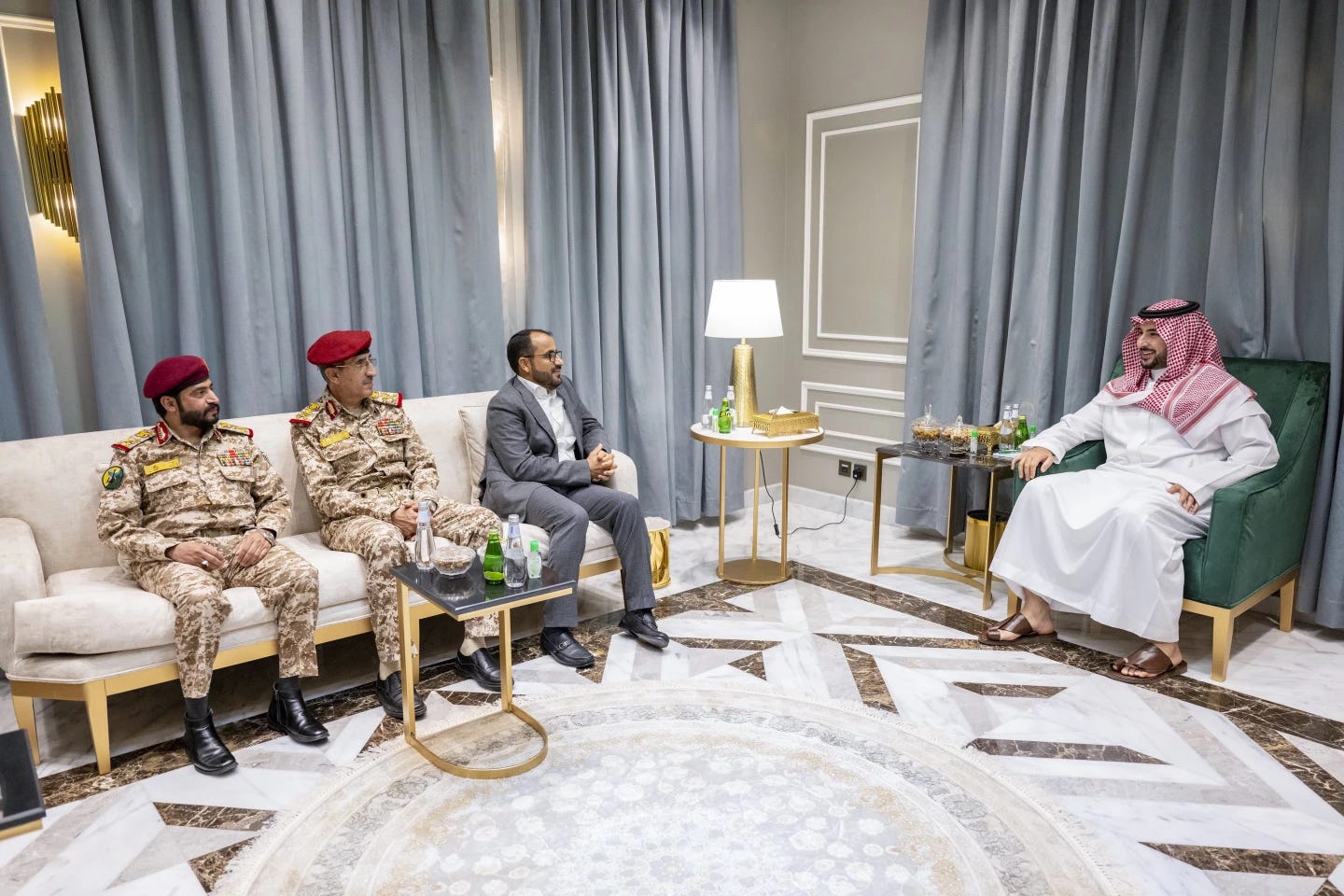 Saudi Defense Minister Prince Khalid bin Salman (right) meets with a Houthi delegation in Riyadh on September 19, 2023. Image source