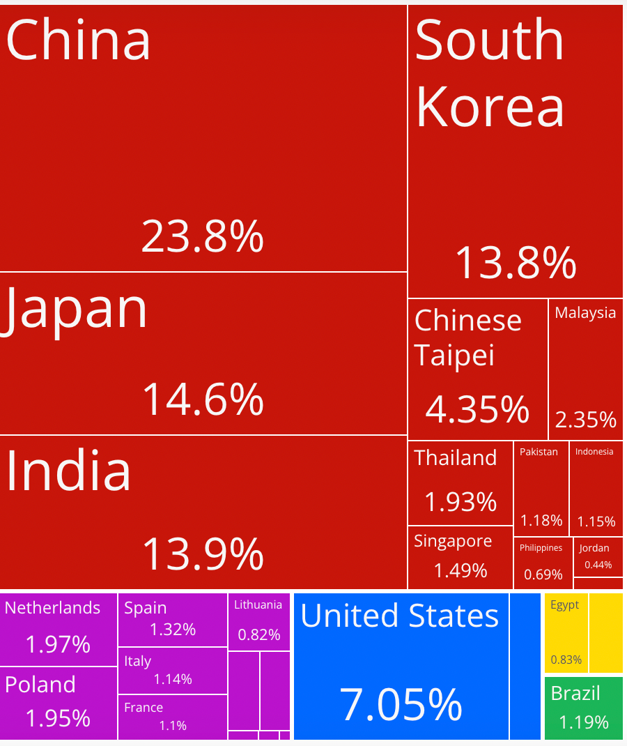 The Asian markets (red) account for the vast majority of Saudi Arabia’s current oil exports. Image source