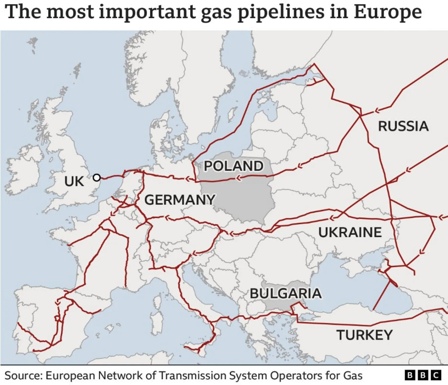 A BBC Map highlighting Europe’s gas pipeline infrastructure. Image source