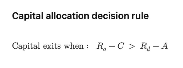 Capital remains onshore when the risk-adjusted domestic return (Rd minus A) exceeds the offshore alternative net of externalization costs (Ro minus C). Capital flight becomes the rational outcome once this inequality reverses.
