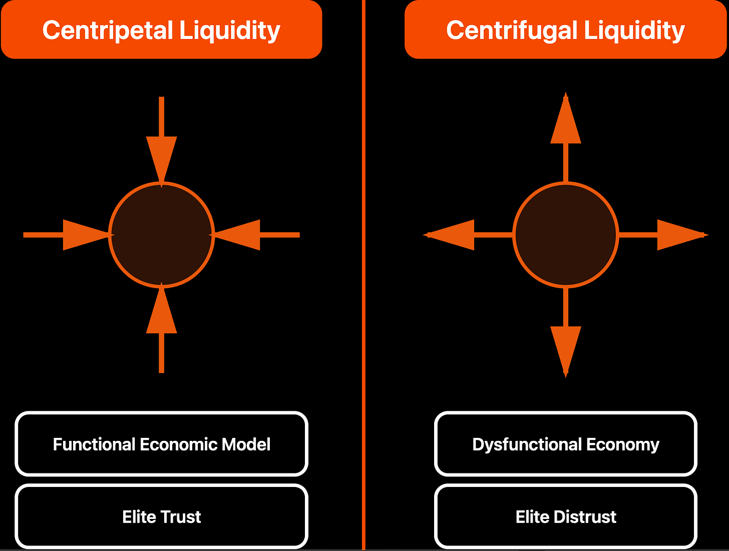 When these systems function as intended, they pull liquidity inward toward core institutions – especially central banks – reinforcing local currencies and supporting essential state functions under stress conditions such as wartime sanctions. As long as confidence holds, capital movement within these systems remains predominantly centripetal, stabilizing rather than eroding the domestic financial base.