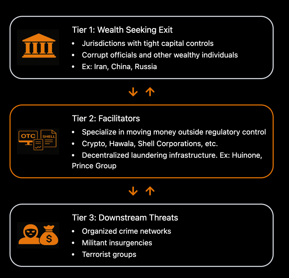 Each of these systems is inherently destabilizing, not only for downstream societies targeted by criminal and militant activity, but also for the states at the origin point, where capital flight erodes economic resilience and governance over time. For this reason, understanding the origin of unregulated capital flows at Tier 1 is imperative for global security.