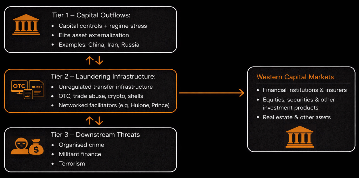 The core risk lies not in any single actor, but in the durable infrastructure that links capital flight, illicit finance, and regulated markets into a continuous financial circuit. Most importantly, as global sanctions regimes increasingly target state-linked actors at Tier 1 and non-state actors at Tier 3, exposure concentrates in Western capital markets where funds moving through this infrastructure are ultimately integrated.
